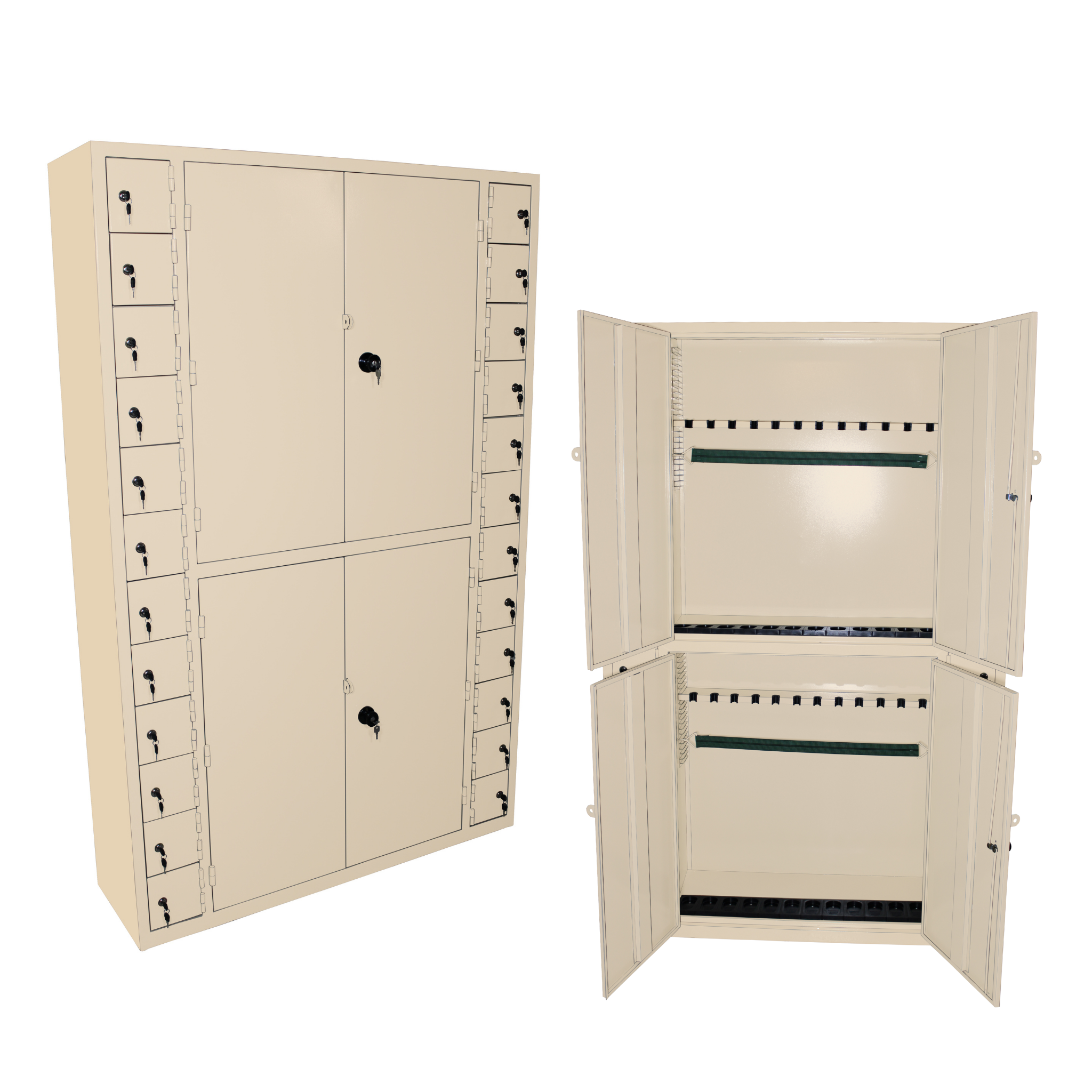الوصف: خزانة أسلحة فولاذية مزودة بـ ٢٤ خزانة منفصلة وقسمين للتخزين.