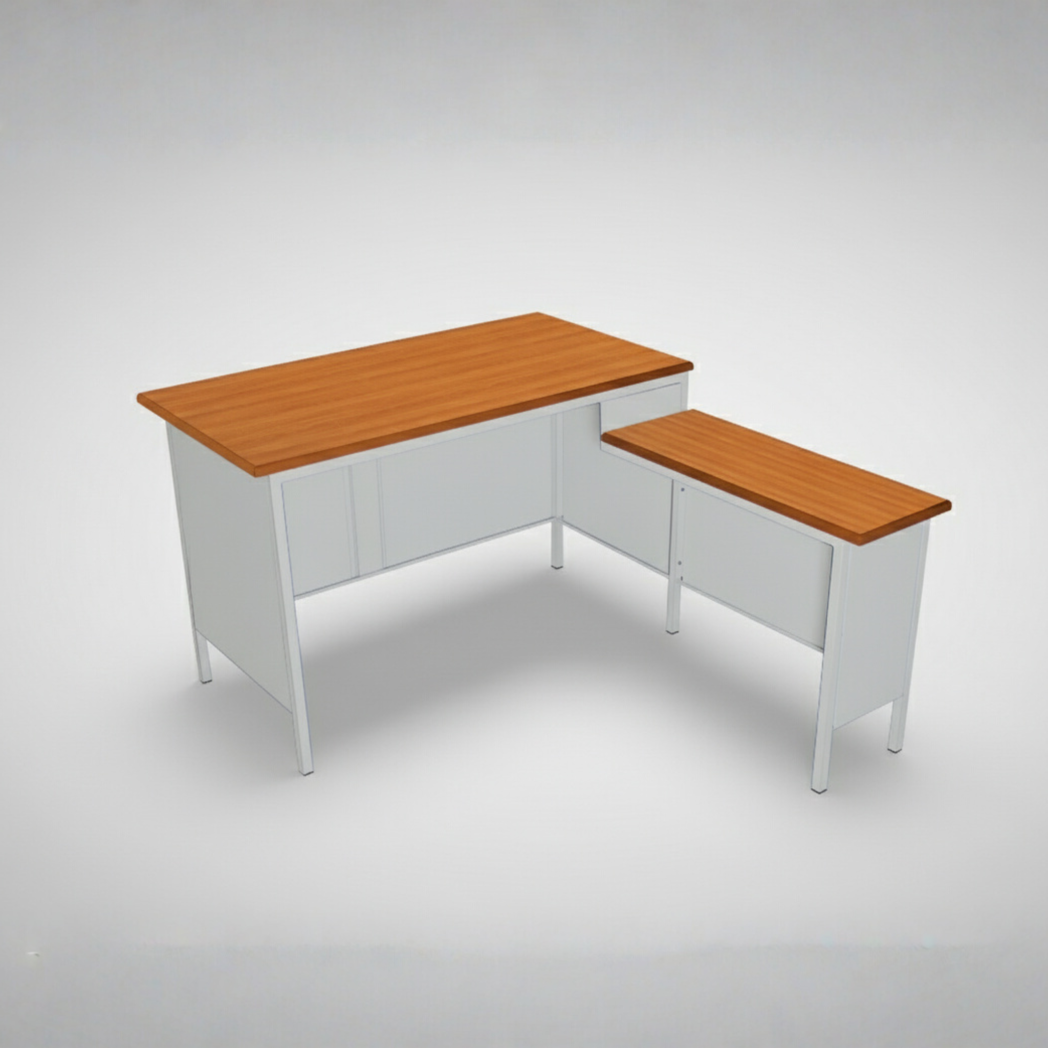 A stylish L-shaped office table combining a main desk and a compact side table for extra workspace.